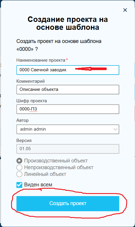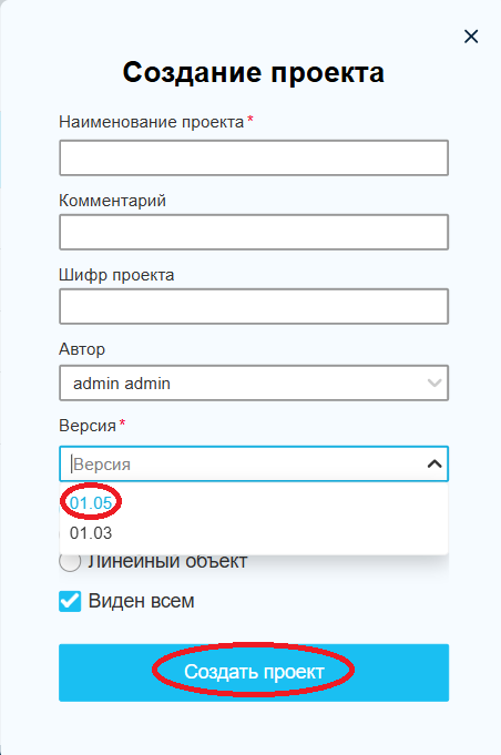 Далее заполняем все пустые поля, выбираем версию 01.05 и нажимаем кнопку Создать проект