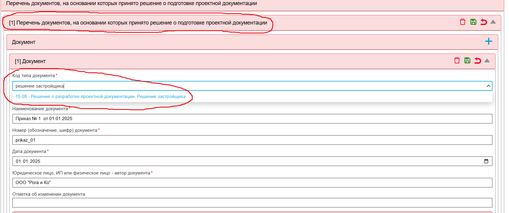 После чего внизу списка появится новый документ, в котором нужно заполнить все необходимые поля.